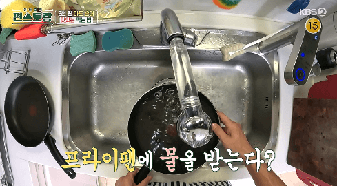 3. 널찍한 프라이팬에 물을 받아서, 가스불에 올립니다.