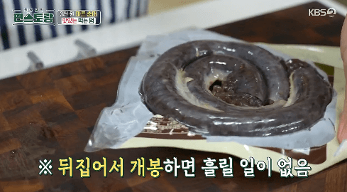 8. 포장을 뜯을 때는 뒤집어서 바닥면이 위로 가게 해서, 뜯으세요. 포장이 모양을 잡아줘서, 흘러내릴 걱정이 없답니다. 순대가 잘 익어서 윤기가 도네요.
