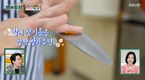 11. 손으로 문질러서 칼 전체에 참기름을 발라줍니다. 칼에 기름이 발라져서, 순대가 부드럽게 썰려요.