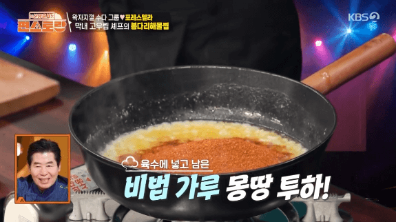 16. 버터가 끓으면 양념 비법 가루를 넣고 섞어줍니다.