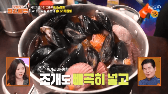 11. 냄비에 꽃게 3마리, 홍합 350g(15개), 홍가리비 400g(15개), 대하 10마리를 넣습니다.