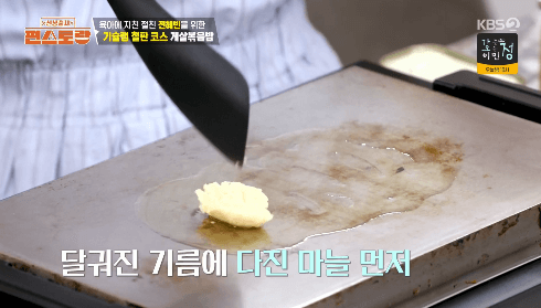 5. 달군 철판에 올리브오일을 두르고, 다진 마늘을 볶아줍니다.