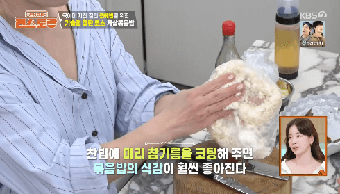 4. 찬밥에 참기름을 약간 넣고 밥알이 뭉치지 않게 코딩하듯 잘 섞어줍니다.(찬밥에 참기름 코팅을 미리 하면, 볶음밥의 식감이 좋아집니다.)