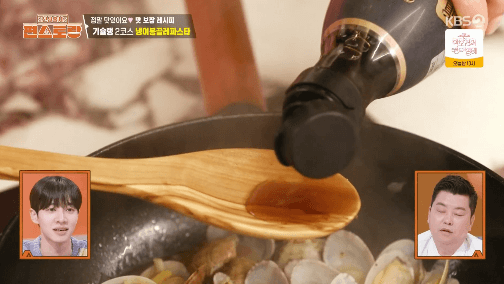 7. 바지락 500g, 소금 약간을 넣고 볶아줍니다.