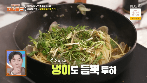 봄내음이 물씬 나는 냉이를 넣은 봉골레 파스타를 만들어 볼게요. 편스토랑에는 신입이지만, 솜씨가 좋아 기슐랭이라고 불리는 기은세씨의 레시피로 한식 느낌 나는 파스타 만들어보세요.