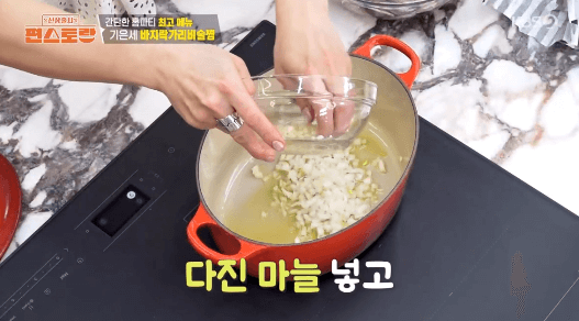 7. 마늘이 노릇하게 익으면, 바지락을 넣습니다.