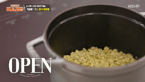 3. 달군 냄비에 물기를 뺀 보리쌀을 넣습니다. (무쇠 주물냄비 기준입니다.)