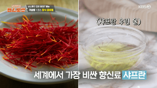 2. 샤프란 1꼬집은 뜨거운 물에 불려 노란색이 나올 때까지 우려줍니다.