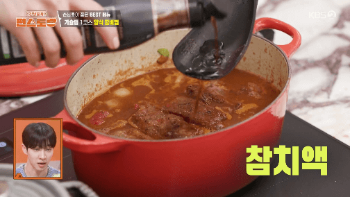 13. 물이 끓어오르면 진참치액 4큰술, 양조간장 2큰술을 넣고 1시간 이상 푹 끓여줍니다.