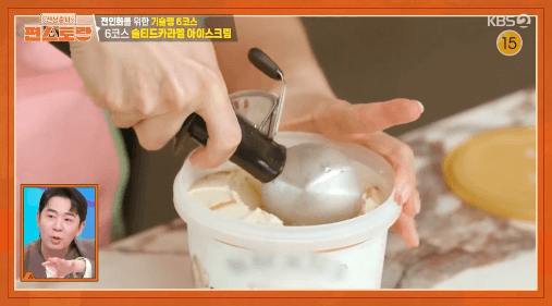 3. 비스켓 위에 카라멜 씨솔트 아이스크림 1 스쿱을 올려줍니다.