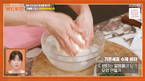 4. 완성된 버터는 얼음물에 담가 빠르게 굳혀준 후 냉동고에 넣어줍니다.