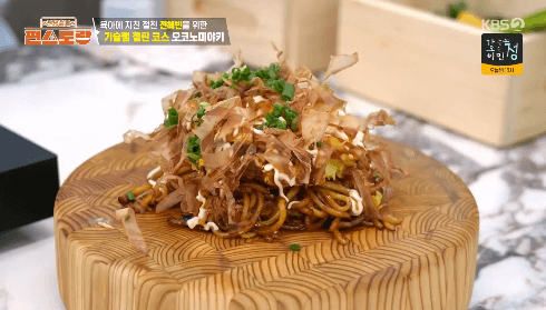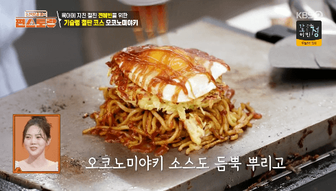 11. 1개의 구운 오코나미야키 위에는 볶은 야끼소바 면을 올려줍니다.