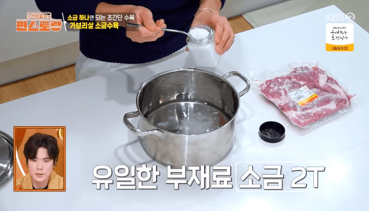 일반적으로 돼지고기 앞다리살로 수육을 많이 만드는데요. 고기 부위를 조금 바꿔 볼게요. 가브리살로 만들건데, 김강우씨 레시피의 소금 수육 만들기도 쉽고, 아주 맛있어요.
