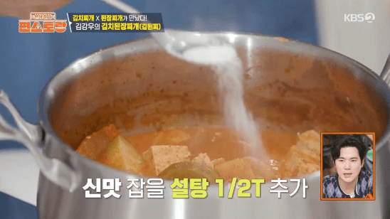 15. 설탕 1/2큰술을 넣고, 한소끔 더 끓여줍니다. (덜 익은 김치를 사용하는 경우, 김칫국물 1 국자를 넣으면 더 깊은 맛이 납니다.)