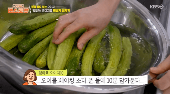 2. 베이킹소다를 푼 물에 백오이 20개를 넣고, 10분간 담가둡니다.