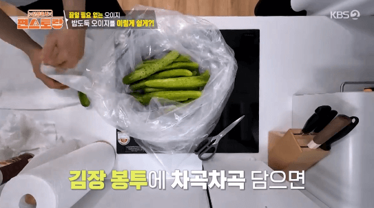 6. 김장용 비닐봉투 2개를 겹친 뒤 오이를 담습니다.