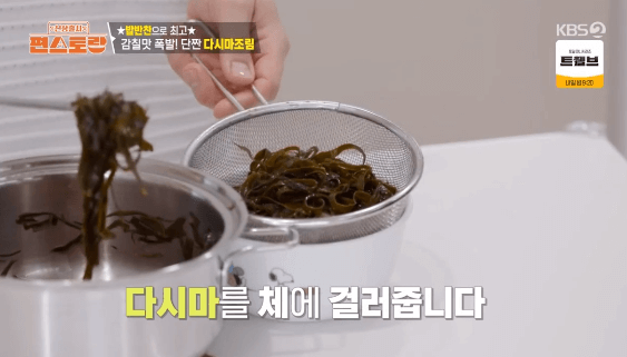 10. 다시마김밥에 사용하기 위해서는 물기를 제거해야 하기 때문에 다시마를 체에 걸러줍니다.