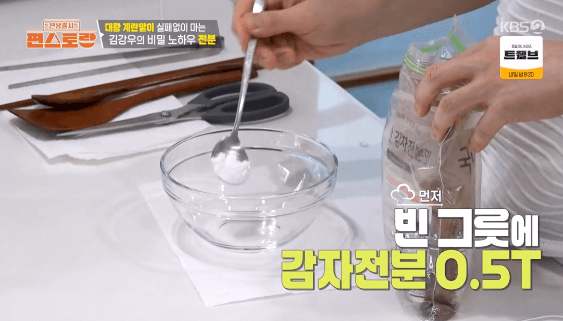 1. 볼에 감자전분 1/2큰술을 넣습니다. (계란물에 전분을 넣으면, 전분이 풀리지 않고 덩어리 질 수 있으므로 전분물부터 만듭니다.)