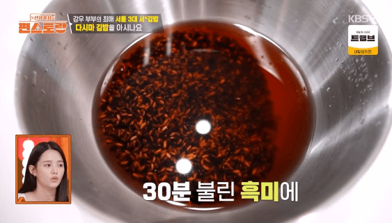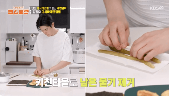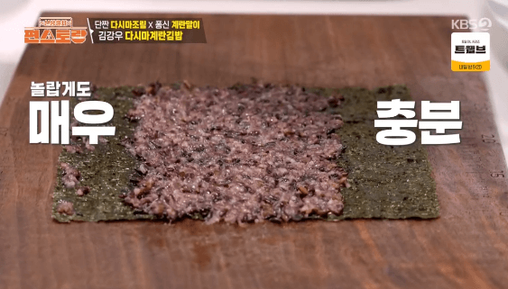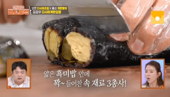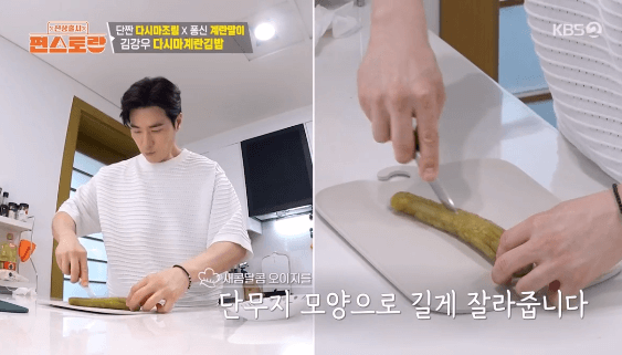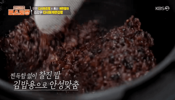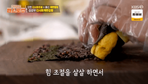 건강에 좋은 재료들만 넣어서, 맛있는 김밥을 만들어 보겠습니다. 김강우씨의 다시마 계란 김밥은 흑미에 다시마조림, 계란말이, 오이지를 주재료로 합니다.