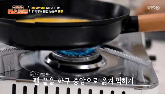 8. 계란말이를 시작할 위치를 화구 중앙으로 놓고, 먼저 익혀줍니다.