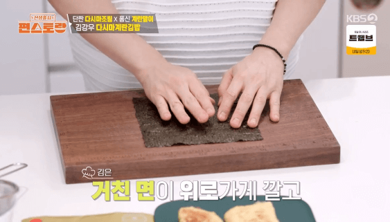 2. 김의 거친면이 위를 향하게 놓습니다.