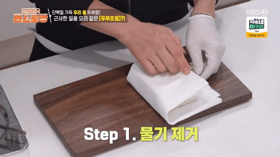 3. 키친타월로 두부의 물기를 제거해 줍니다.