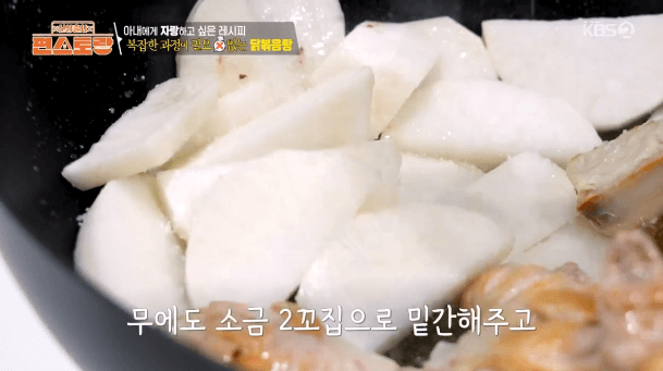 15. 팬 바닥에 무를 깔고, 닭을 위에 올립니다. 중불에서 5분간 구워줍니다.