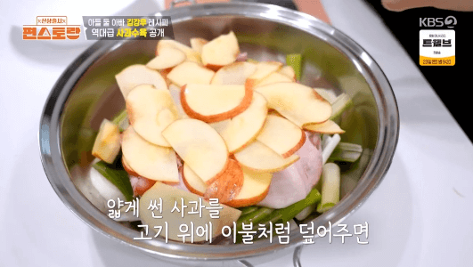 8. 썰어둔 사과로 고기를 덮어줍니다. (물은 넣지 않습니다.)