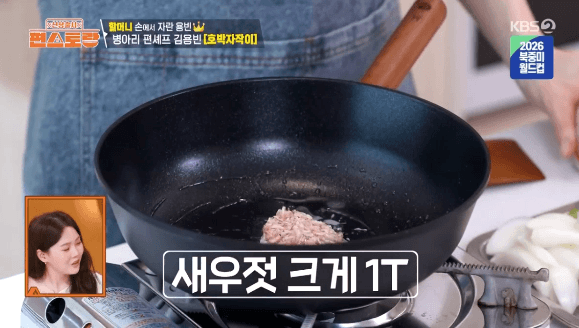 3. 팬에 식용유를 두르고, 새우젓 1큰술을 볶아줍니다. (새우젓을 먼저 볶으면 비린내가 날아가고 감칠맛도 올라갑니다.)