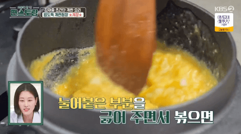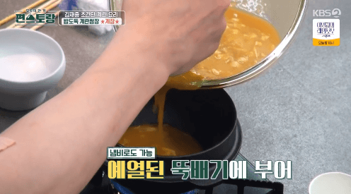 7. 예열된 냄비에 계란물을 붓고, 저으면서 익혀줍니다.