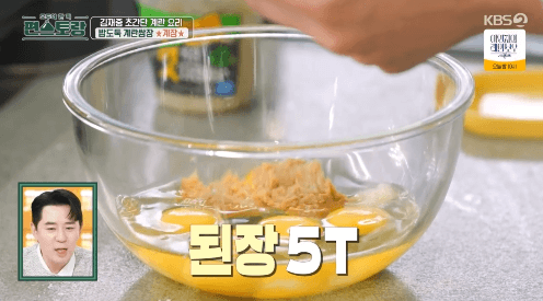 4. 계란물에 다진 마늘, 된장 5큰술을 넣습니다.