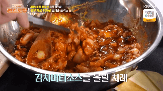 6. 팬에 버터 2큰술을 더 녹이고, JJ맛김치를 넣고 10분간 중약불에서 볶아서 김치버터소스를 만듭니다.