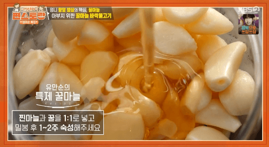 2. 밀폐용기에 찐 마늘과 꿀을 1:1 비율로 넣고, 1~2주 정도 숙성시켜서 꿀마늘을 만듭니다.