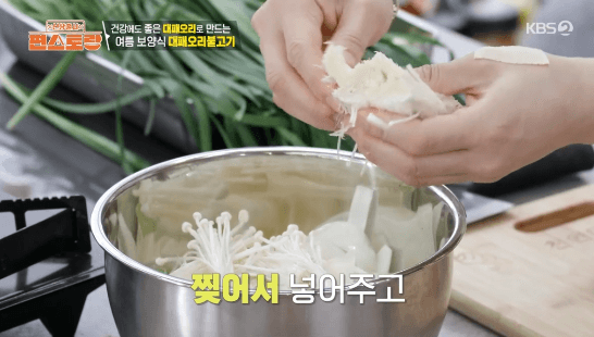 2. 팽이버섯은 밑동을 자르고 손으로 찢어줍니다.