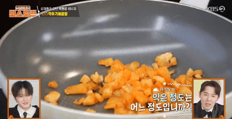 1. 깍두기는 잘게 잘라서, 프라이팬에 넣어줍니다.