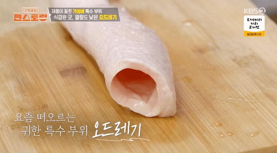 이번 방송에서는 김재중씨가 '오드레기'라는 소의 특수부위로 여러 가지 요리를 만들었습니다. 처음 만들 요리는 버터구이 오드레기인데요. 버터구이 오징어를 연상시키는 쫄깃한 식감을 느낄 수 있습니다.