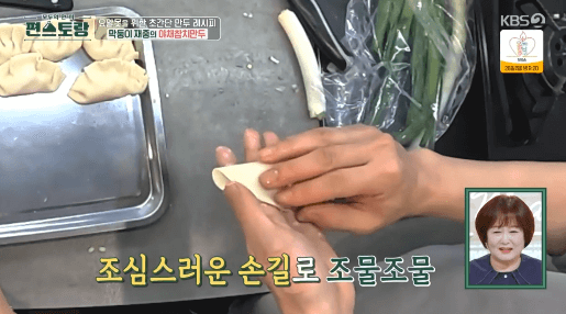 8. 만두피 끝부분을 눌르고, 주름을 잡아주며 만두를 만듭니다.