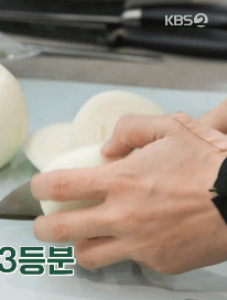 6. 양파 2개를 가로로 3등분 해줍니다. 무 반통을 나박 썰기 합니다.