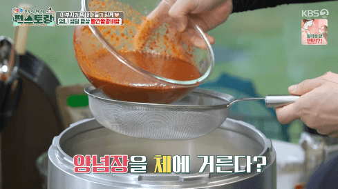 16. 양념장을 체에 걸러 압력솥에 넣습니다. (체로 건더기를 걸러서 맑은 국물을 만듭니다. 체를 국물에 살짝 담가 걸러주며 양념을 더 편하게 내릴 수 있습니다.)
