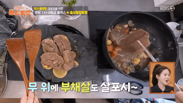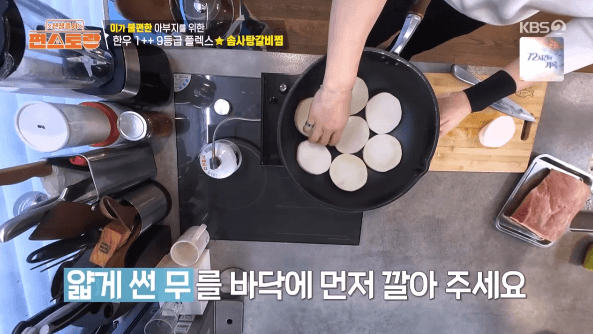 10. 냄비에 무를 깔고, 그 위에 부챗살을 올려줍니다.