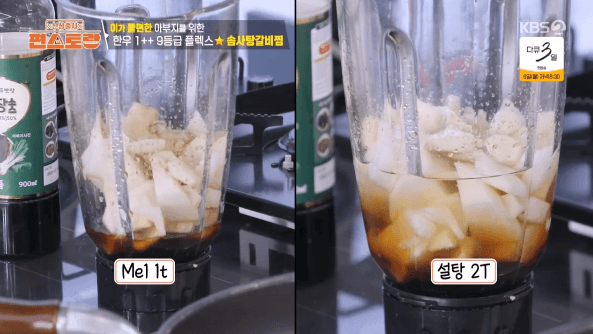 9. 맛술 3~4큰술, 참치액 2쪼록, 다시마맛간장 4~5큰술, 미원 1작은술, 설탕 2큰술, 물 200ml를 넣고 믹서기를 갈아줍니다.
