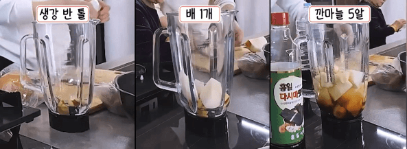 8. 믹서기에 생강 반 톨, 배 1개, 깐 마늘 5알, 간장 쪼록 만큼 넣습니다. ('쪼록'은 김재중씨의 대략적인 계량입니다.)