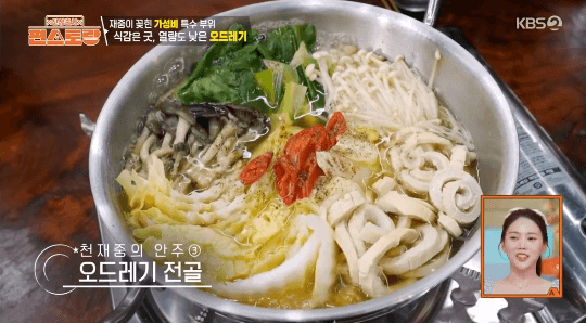 소의 특수부위인 '오드레기'를 사용해서 전골을 만들어 보겠습니다. 오드레기는 요리하기 전에 튀김가루를 사용해서 손질하세요.