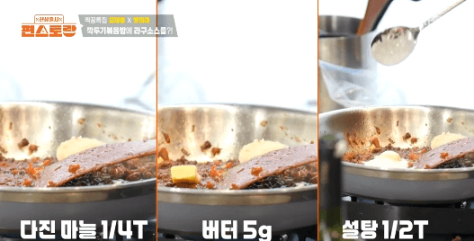 맛있게 익은 깍두기로 볶음밥을 만들어 보세요. 차돌박이를 구운 뒤 김재중씨의 비법 소스로 양념을 해서 같이 먹으면 더 맛있어요. 차돌 깍두기 볶음밥 - 김재중의 JJ맛가루 만들기 편