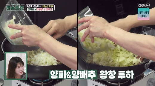 9. 양파와 양배추를 넣고 숨이 죽을 때까지 볶아줍니다.