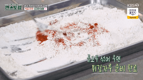7. 마늘가루 1작은술, 고춧가루 2작은술을 넣고 가루들을 골고루 섞어서 튀김가루를 만들어줍니다.