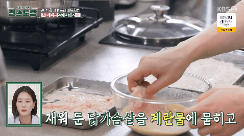 11. 닭가슴살에 반죽물을 묻힙니다.