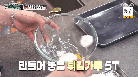 8. 볼에 달걀 1개를 풀고, 만들어 놓은 튀김가루 5큰술을 넣습니다.