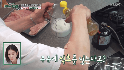2. 볼에 우유 200ml와 식초 3큰술을 넣고 점성이 생길 때까지 섞어줍니다.