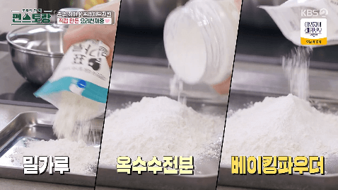 5. 큰 쟁반에 밀가루 100g, 옥수수전분 50g, 베이킹파우더 1작은술을 붓습니다.